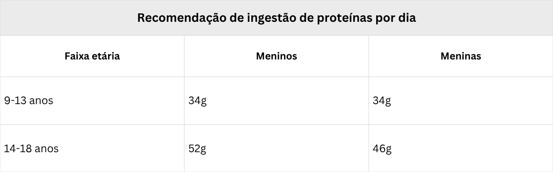 O rápido crescimento da durante a adolescência exige elevada oferta de proteínas. A quantidade de proteína recomendada para adolescentes varia entre 34 a 52 gramas por dia (meninos) e 34 a 46 gramas por dia (meninas), de acordo com a idade, conforme o quadro a seguir2: