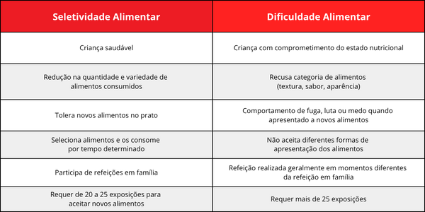 Veja aqui o quadro elaborado pela Sociedade Brasileira de Pediatria com as principais diferenças entre seletividade alimentar e dificuldade alimentar:2